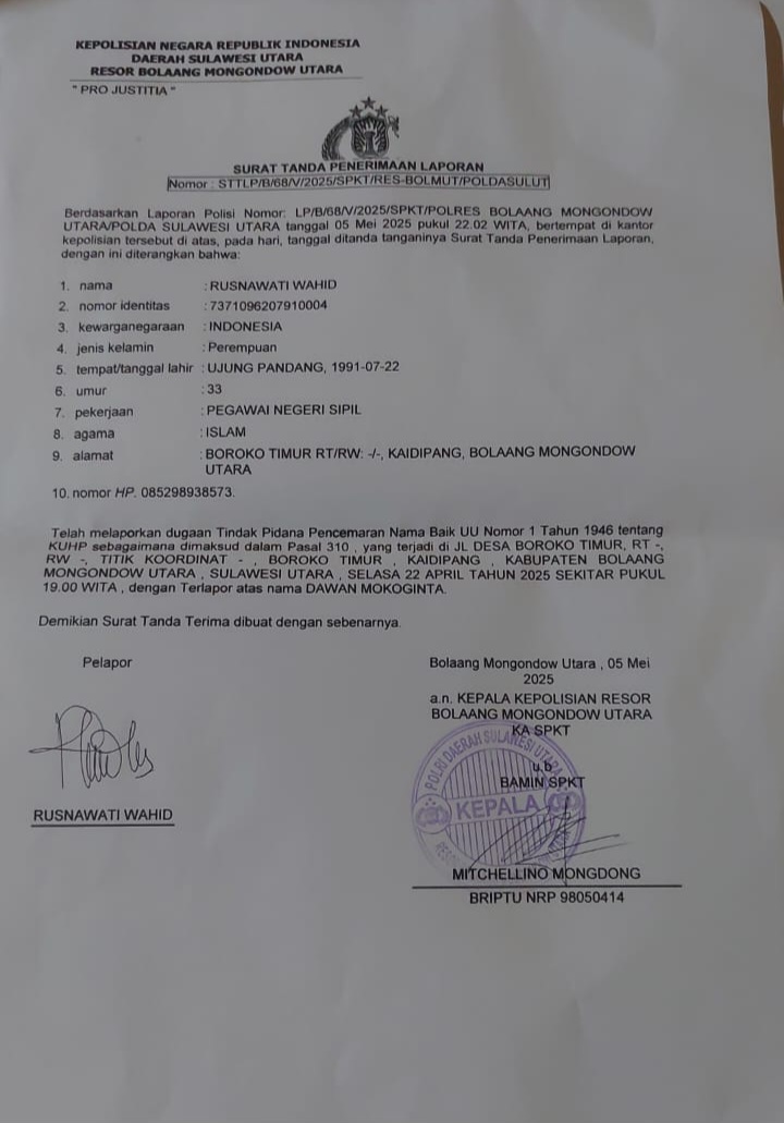 Laporan tersebut didaftarkan pada 5 Mei 2025 di Polres Bolmut, sebagaimana tertuang dalam Surat Tanda Penerimaan Laporan Nomor: STTLP/B/68/V/2025/SPKT/RES-BOLMUT/POLDASULUT.