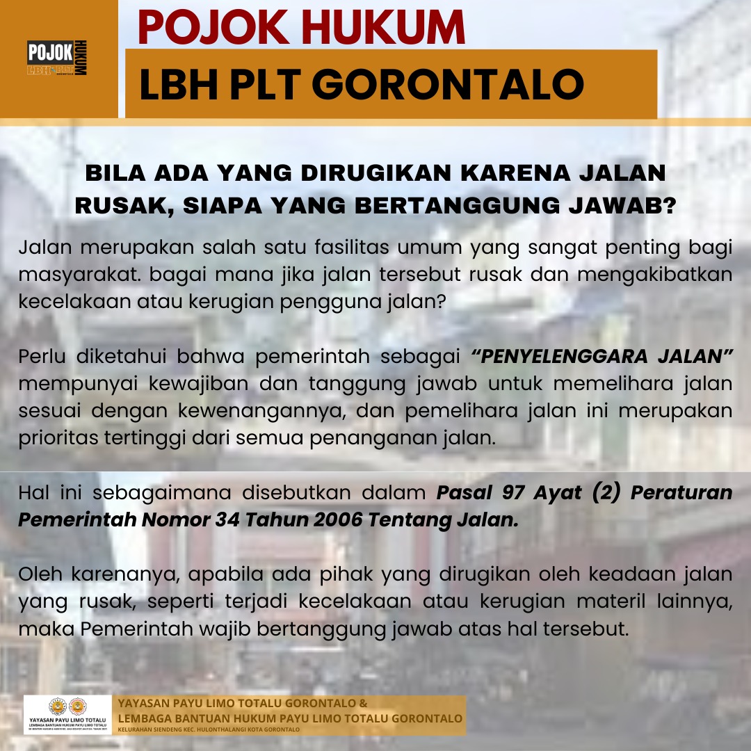 Republish.id, GORONTALO – Jalan merupakan salah satu fasilitas umum yang sangat penting bagi masyarakat. Namun, Bagaimana jika jalan tersebut rusak dan mengakibatkan kecelakaan atau kerugian bagi pengguna jalan?