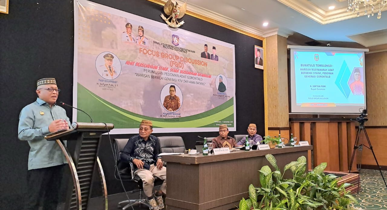 Republish.id, GORONTALO – Upaya menjaga kelestarian adat Gorontalo terus dilakukan. Bupati Gorontalo, Sofyan Puhi, hadir sebagai narasumber dalam Focus Group Discussion (FGD) tentang Perumusan Adat Gorontalo yang diselenggarakan Dinas Perpustakaan dan Kearsipan Provinsi Gorontalo di Grand Q Hotel, Kamis (11/09/2025).
