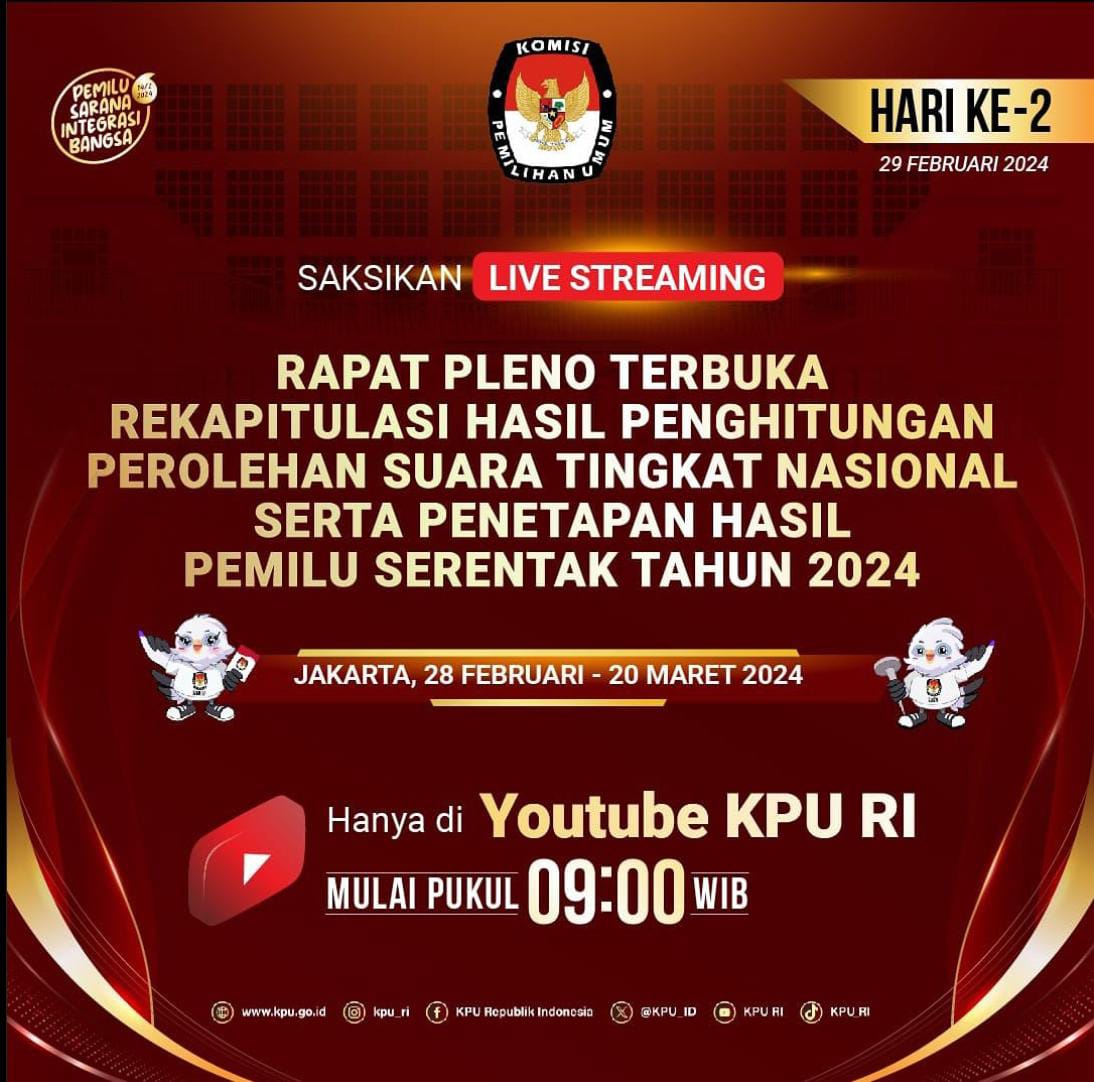 Dikutip dari laman resmi KPU RI, Rapat Pleno ini juga disiarkan secara terbuka di kanal YouTube KPU RI pada 28 Februari hingga 20 Maret 2024 dan dimulai pada pukul 09.00 WIB.
