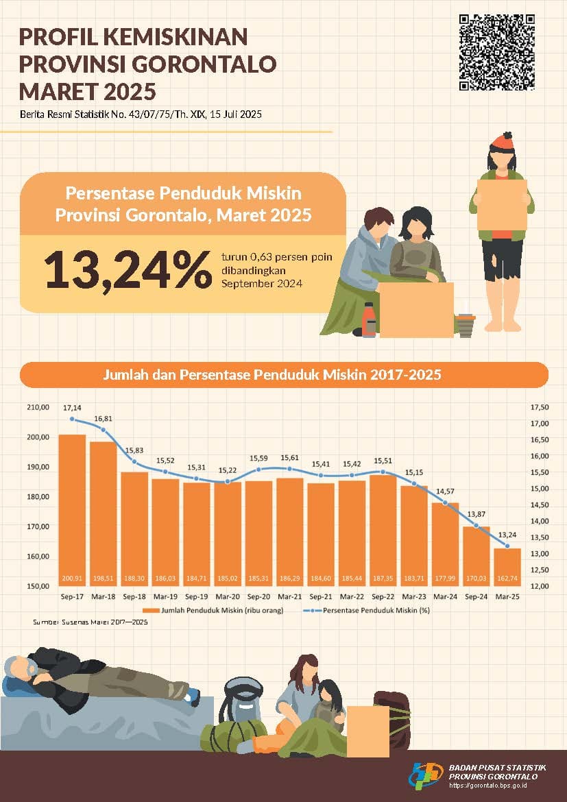 Sementara itu, data Badan Pusat Statistik (BPS) yang dirilis pada 25 Juli 2025 mencatat persentase penduduk miskin di Provinsi Gorontalo pada Maret 2025 sebesar 13,24 persen. Angka tersebut turun 0,63 persen poin dibandingkan September 2024.
