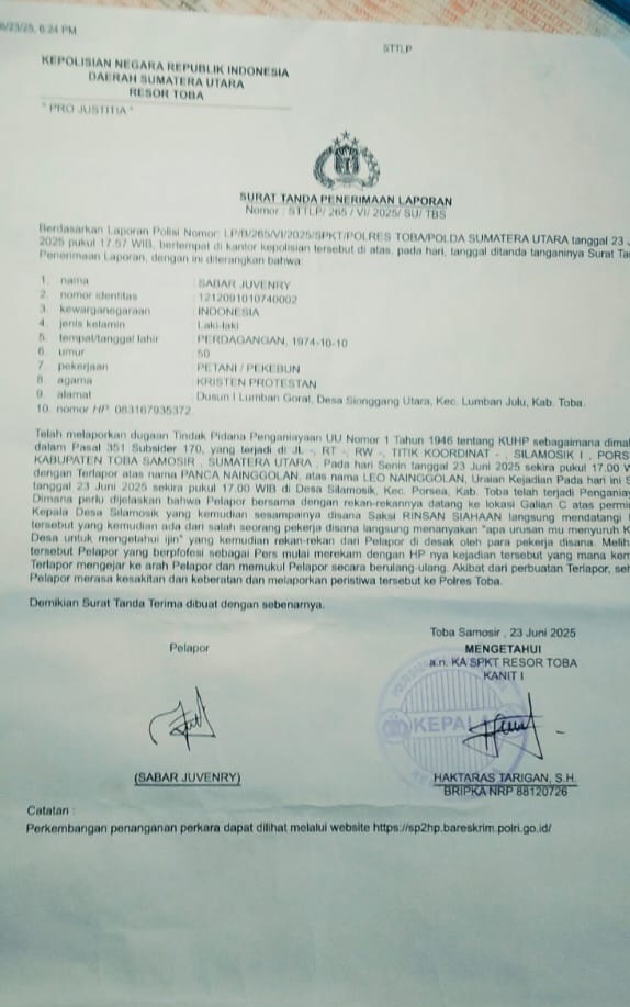 Sabar kemudian melapor ke Polres Toba dan laporan diterima dengan nomor: LP/B/265/VI/2025/SPKT/Polres Toba/Polda Sumut, tertanggal 23 Juni 2025 pukul 17.57 WIB.