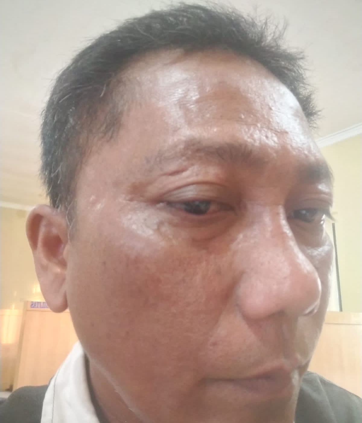 Caption: Korban penganiayaan, Sabar Juvenry Manurung yang dianiaya saat lakukan liputan, Senin (23/06/2025) di desa Silamoaik I kecamatan Porsea kab Toba, (Foto Istimewa)